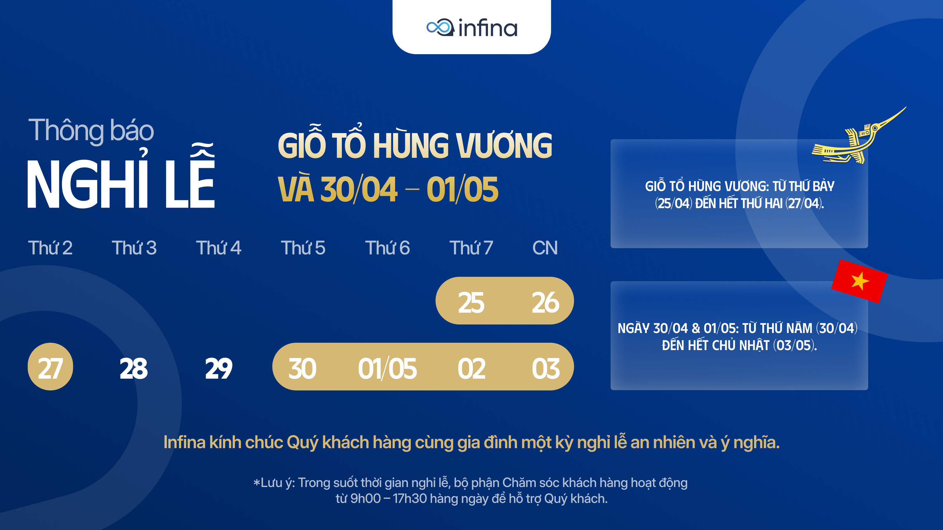 - Lưu ý: Infina làm việc bình thường vào các ngày 28/04 và 29/04 và chính thức từ 04/05.